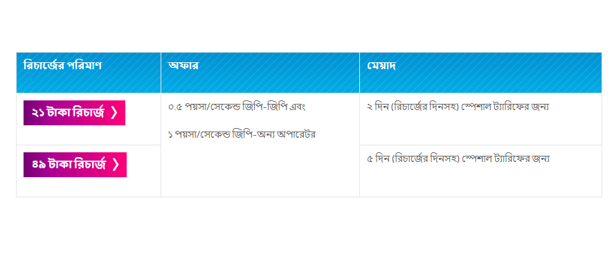 - ক্রয়কৃত মিনিট, বোনাস মিনিট, বোনাস অ্যামাউন্ট ও ইমার্জেন্সি ব্যালেন্সের ক্ষেত্রে স্পেশাল ট্যারিফ প্রযোজ্য নয়। ক্রয়কৃত মিনিট, বোনাস মিনিট, বোনাস অ্যামাউন্ট ও ইমার্জেন্সি ব্যালেন্স প্রথমে খরচ হবে এবং এরপর স্পেশাল ট্যারিফ প্রযোজ্য হবে।