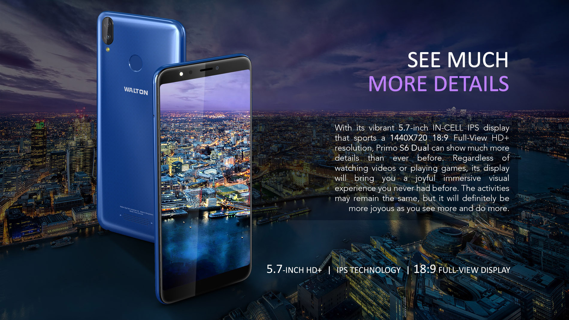 ওয়ালটন সুন্দর নীল এবং কালো কালারে বাজারে এনেছে তাদের আরেকটি আকর্ষণীয় স্মার্টফোন প্রিমো এস৬ এর সাক্সেসর প্রিমো এস৬ ডুয়াল। প্রিমো এস৬ এর তুলনায় এর মুল পার্থক্যটা হল এর রিয়ার প্যানেলের ডুয়াল ক্যামেরা মডিউল, যা এস৬ এ ছিল না। ডিভাইসটি লেটেস্ট অ্যান্ড্রয়েড ৮.১.০ অপারেটিং সিস্টেম চালিত, যা সত্যিই অ্যান্ড্রয়েড প্রেমী বিশেষ করে যারা লেটেস্ট আপডেটে থাকতে ভালোবাসেন তাদের জন্য দারুন খবর। স্মার্টফোনটির দাম ১৪৯৯৯ বা ১৫০০০ টাকা।