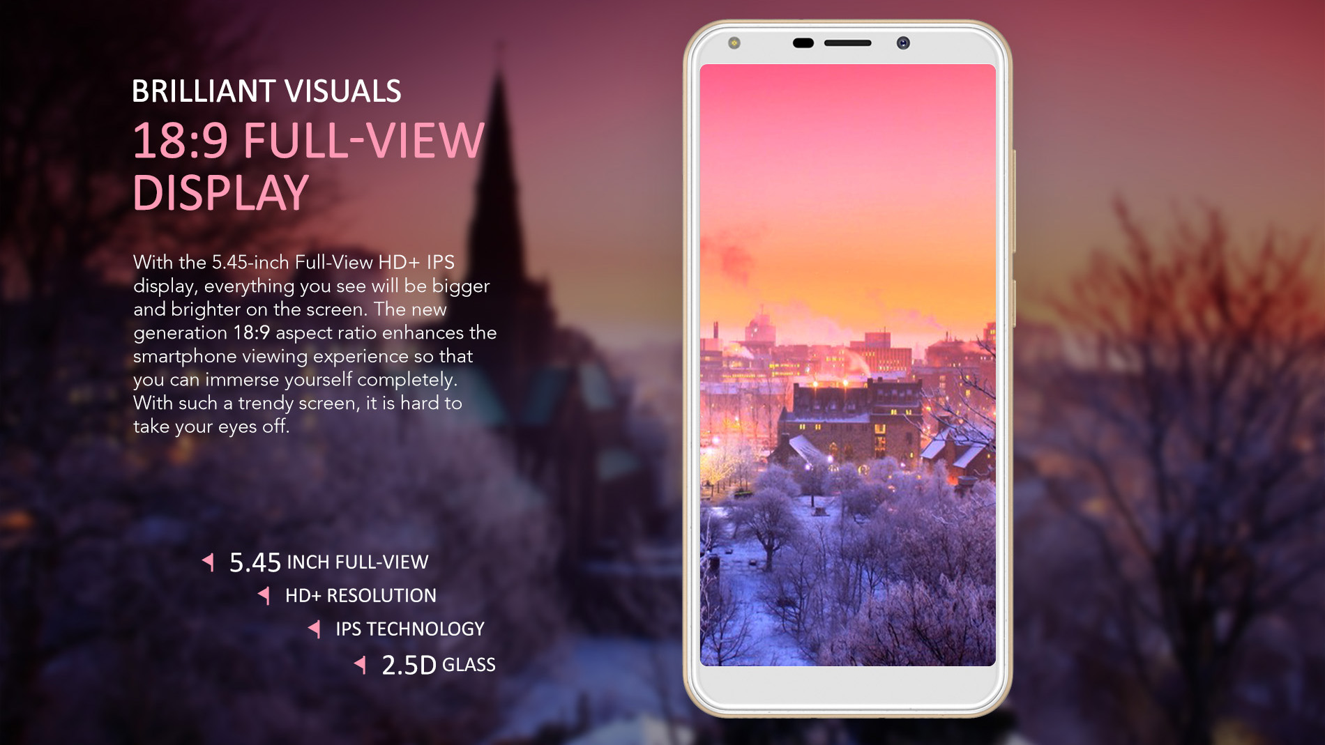 ডিভাইসটিতে রয়েছে ৫.৪৫ ইঞ্চি এর এইচডি আইপিএস প্যানেল। আর আকর্ষনীয় বিষয় হল এটি একটি ১৮:৯ রেশিও এর ফুল ভিউ ডিসপ্লে। গেমিং, মুভি ওয়াচিং এর ক্ষেত্রে থাকছে প্লাস পয়েন্ট। এটি এইচডি তথা হাই ডেফিনেশন ডিসপ্লে যার রেজুলেশন ১৪৪০*৭২০ পিক্সেল। ডিভাইসটি ৫ ফিংগার মাল্টিটাচ সাপোর্টেড। আইপিএস ডিসপ্লে হওয়ার কারনে নি:সন্দেহে ভিউইং অ্যাঙ্গেল নিয়ে কোন সমস্যা হওয়ার কথা না। ডিসপ্লেটি সাইড দিয়ে ২.৫ ডি কার্ভড হওয়ার কারনে স্মার্টফোনের ডিজাইনকে এটি বাড়িয়ে দিয়েছে কয়েকগুণে। ডিসপ্লেটি ২৬ মিলিয়ন কালার সাপোর্টেড। ডিসপ্লে ২.৫ ডি কার্ভড এবং ব্যাক পার্ট বাকানো হওয়ার কারনে ; স্মার্টফোনটি হাতে নিলে সাইড দিয়ে সুন্দর একটি রাউন্ড কাট অনুভব করা যাবে। রিয়ার প্যানেলে ক্যামেরা এবং ফিংগার প্রিন্ট সেন্সর মডিউল দেখতে খুবই সুন্দর এবং আকর্ষনীয়। ডিভাইসটির আপার প্যানেলে রয়েছে ৩.৫ এমএম হেডফোন জ্যাক, ২.০ ইউএসবি পোর্ট এবং হেডফোন জ্যাক। বাম সাইডে রয়েছে ভলিউম এবং পাওয়ার বাটন।