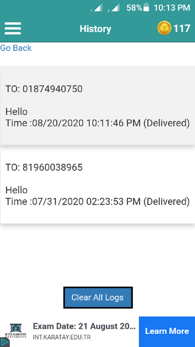 এখানে আপনি যতজনকে ম্যাসেজ পাঠিয়েছেন সবকিছু দেখতে পাবেন। এবং আপনি যদি চান ম্যাসেজ গুলো এখান থেকে ডিলেট করে দিতে তার জন্য নিচে থাকা Clear All Logs বাটনে ক্লিক করুন। তাহলে সব ম্যাসেজ ডিলেট হয়ে যাবে। এবার চলুন জেনে নেওয়া যাক কিভাবে পয়েন্ট আর্নিং করবো।
