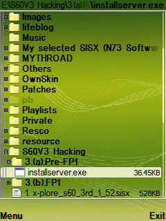 7. এবার X-Plore দিয়ে মেমোরীকার্ডে থাকা 3.(a).Pre-FP1 বা 3.(b).FP1 ফাইলে যান। আপনার ফোনটি Pre-FP1 না FP1 তা উপরের লিস্ট থেকে দেখে নিন। আমার ফোনটি Pre-FP1 (NOKIA N73) তাই আমি Pre-FP1 ফোল্ডারে ঢুকে installserver.exe ফাইলের কাছে যাচ্ছি।