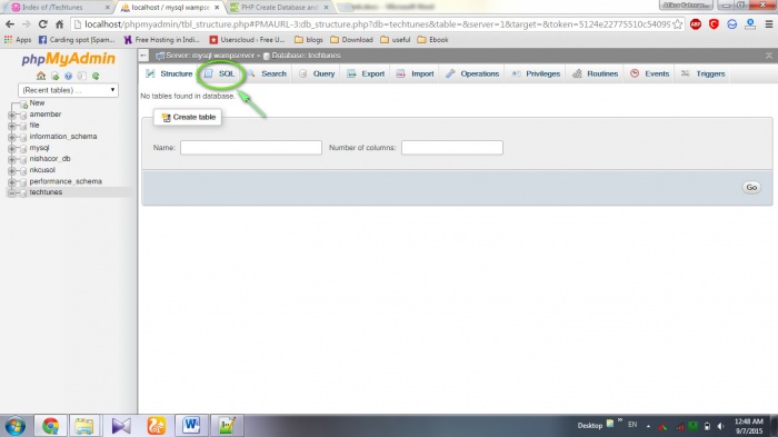 পিসিতে wamp server চালু করুন। না বুঝলে আমার আগের টিউনগুলো দেখুন। এবার ব্রাউজার ওপেন করে http://localhost/phpmyadmin এ যান। এবার আগে থেকে তৈরী করা techtunes নামক ডাটাবেইজে প্রবেশ করুন। নিচের মতো দেখাবে। যা একদম ফাকা।