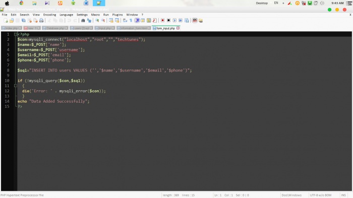 প্রথেমই আগে থেকে তৈরী করা wamp -> www -> Techtunes ফোল্ডারে প্রবেশ করুন। আমাদের ২ টি ফাইল তৈরী করতে হবে। একটি HTML ফর্ম আরেকটি PHP ফাইল। এবার form.html ও form_input.php নামে ২টি ফাইল তৈরী করুন। এবং form.html ফাইলে নিচের কোডগুলো দিয়ে ফাইল সেভ করে নিন।