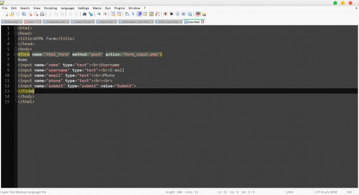 ২। form.html ফর্মে name, username, email, phone এই ৪ টি ইনপুচ বক্স রয়েছে। এবং এই চারটি ইনপুট বক্সের নাম দেওয়া হয়েছে যথাক্রমে name, username, email, phone। যার ফলে বক্সে ডাটা লিখে সাবমিট বাটনে ক্লিক করলে ইনপুট বক্সের ডাটাগুলো যথাক্রমে name, username, email, phone নামে form_input.php ফাইলে আসবে [ যেহেতু form action=”form_input.php” ধরে নেওয়া হয়েছে ]।