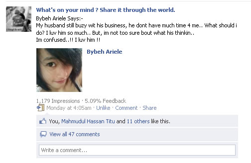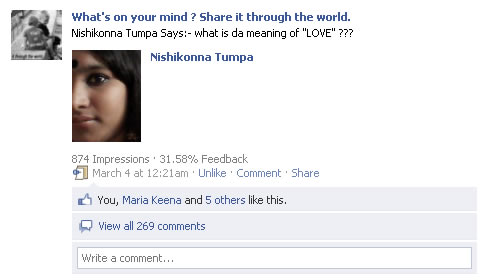 এখানে মানুষ তাদের Status Share করে, এবং আমরা তাদের Status তাদের Profile এর link সহ আমাদের wall এ share করে দেই যেন আমাদের পেইজ এর সব মেম্বাররা তা দেখতে পারে । আমার পেইজ এর কিছু নমুনা ছবি নিচে তুলে ধরা হল :-