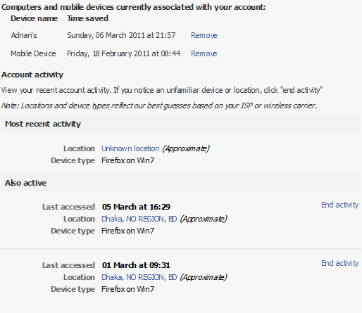 কোন পাবলিক কম্পিউটারে ফেসবুকে লগইন করে আসার সময় আর লগআউট করতে ভুলে গেছেন। এখনকি আবার লগআউট করতে আবার সেই কম্পিউটারে ছুটবেন? দরকার নেই। অন্য যেকোন কম্পিউটার থেকেই লগআউট করতে পারেন। এজন্য Settings > Account Settings এ যান। এবার Account security এর পাশে change এ ক্লিক করুন। তাহলে অপশন শো করবে। এবার স্ক্রোল করে নিচে Account activity তে যান। যে যে ডিভাইস এই মুহুর্তে আপনার একাউন্টে লগডইন আছে সেগুলো শো করবে। সাথে থাকবে ডিভাইসগুলোর ইনফর্মেশন। সেই তথ্য দেখে ডিভাইসটি চিনে নিন এবং ডানপাশে End activity তে ক্লিক করুন। অল্পকিছুক্ষন আগে যে যে ডিভাস থেকে লগইন করা হয়েছে সেগুলো Most recent activity তে শো করবে।