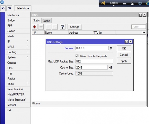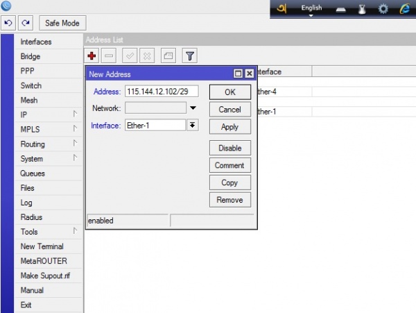 - ৭। প্রথমে Menu থেকে IP > Address এ ক্লিক করুন। এরপর উইন্ডোটি ওপেন হলে + (add) icon এ ক্লিক করুন। আমরা এখানে উদাহরণ সরূপ একটি IP address, subnet mask, gateway address and DNS server address এন্ট্রি করব। Address এর ঘরে আপনার IP address subnet mask সহ এন্ট্রি করুন। Interface এর ঘরে ether 1 (অথবা যেকোনো ether) Select করে Apply>Ok করুন।