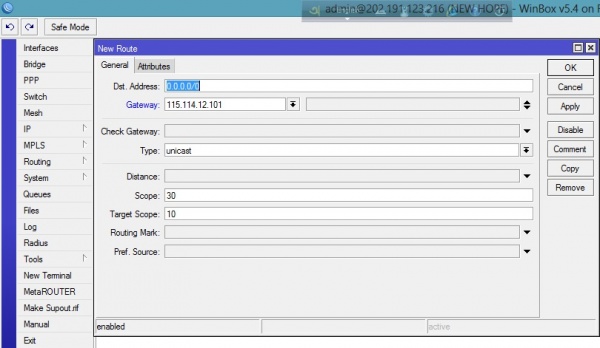 - ৮। Gateway Address Add করার জন্য IP>Routes> +(add) এ ক্লিক করুন। এখানে Gateway ঘরে আপনার গেটওয়ে এড্রেস টাইপ করুন। এরপর Apply>OK করুন।