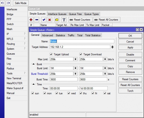 Time (optional) : যদি মনে করেন মূল Bandwidth (256k/256k) কোন একটি নির্দিষ্ট সময়ে থাকবে তাহলে কখন থেকে কখন তা উল্লেখ করুন ২৪ ঘণ্টা ফরম্যাট এ। এখানে উল্লেখ্য যদি কোন আইপির একটি Time Slot create করেন, যেমন- 00.00.00-07.59.59 তাহলে এই আইপির আরও ২ টি queue করে তাতে বাকী time slot গুলি উল্লেখ করে দিন। যেমন- 08.00.00-15.59.59 and 16.00.00-23.59.59. নইলে Bandwidth loop সম্পরকৃত জটিলতা দেখা দিতে পারে।