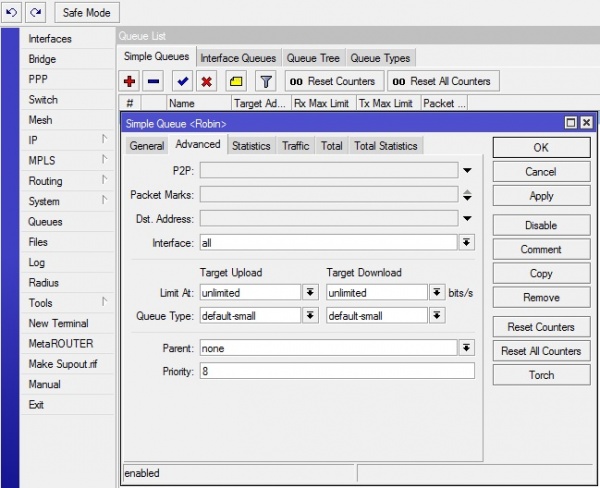 Priority(optional) : এই আইপির Bandwidth Priority. By default 8. আপনি যদি মনে করেন এই আইপির Bandwidth সবচেয়ে বেশি প্রয়োজন তাহলে Priority 1 করে দিন। উদাহরনঃ মনে করুন আপনার অফিস এর Total Bandwidth 1 Mbps. এখন ১৫ টি পিসি’তে আপনি 256k/256k সেট করেছেন। এমতাবস্থায় কেউই একযোগে 256kbps Bandwidth পাবে না। এখন যদি আপনি মনে করেন যে অন্য সব queue Bandwidth crisis এ ভুগলেও অন্তত ১ টি বা একাধিক queue যাতে সব সময় চাহিবা মাত্র তাদের Bandwidth পায় তাহলে ওই সকল queue এর priority = 1 করে দিন।