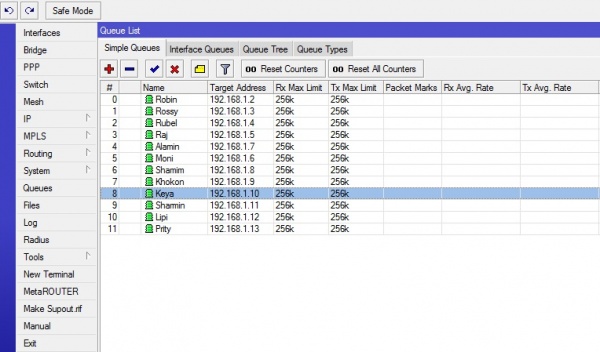 সবশেষে Apply>OK তে ক্লিক করুন। তখন দেখবেন ১ টি queue তৈরি হয়ে গিয়েছে। এভাবে আপনার সব আইপি গুলির queue তৈরি করুন। মনে রাখবেন যে সকল আইপি আপনার নেটওয়ার্ক এ ব্যাবহার হচ্ছে অথচ আপনি তাদের queue তৈরি করেনি মানে Bandwidth control set করেন নি ওই সকল আইপি Unlimited Bandwidth পাবে। একই কথা প্রযোজ্য যদি আপনি আপনার কোন queue disable(x) করে দেন।