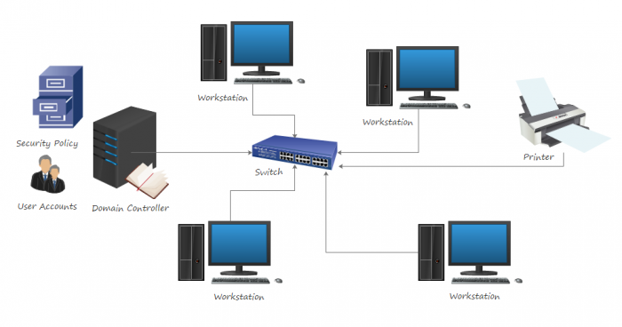 এক সার্ভারবিশিষ্ট নেটওয়ার্ক খুব সহজেই ম্যানেজ করা যায়, নেটওয়ার্ক অ্যাডমিনিস্ট্রেটরকে কেবল একটি সার্ভার নিয়েই ব্যস্ত থাকতে হয়, কোন সার্ভারে কি কাজ হবে সে নিয়ে মাথা ঘামাতে হয় না। কিন্তু এটি আসলে খুবই বিপদজনক। সব ডিম একই ঝুড়িতে রাখলে যেমন বিপদ ঘটতে পারে, তেমনি একটিমাত্র সার্ভারে পুরো নেটওয়ার্কের রিসোর্স রাখলে বিপদ দেখা দিতে পারে। সেই সার্ভার কোন কারণে বিকল হয়ে গেলে নেটওয়ার্ক ইউজাররা পুরোপুরি রিসোর্স থেকে বঞ্চিত হবে, এমনকি নেটওয়ার্কে লগ-ইন পর্যন্ত করতে পারবে না। ছোটখাটো অফিসে, যেখানে বিজনেস কিংবা মিশন ক্রিটিক্যাল কোনো কাজ হয় না কেবল সেখানেই এক সার্ভারবিশিষ্ট নেটওয়ার্ক ব্যবহার করা যেতে পারে। এক সার্ভারবিশিষ্ট নেটওয়ার্ক হতে পারে চিত্র ১.১১ - এর মতো।