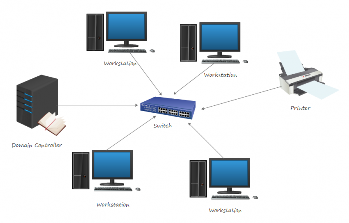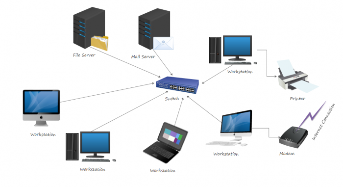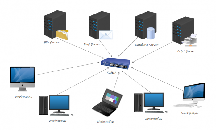 এটি প্রাথমিক স্তরের নেটওয়ার্ক। প্রথমদিকে ছোটখাটো কোম্পানি সাধারণত পিয়ার-টু-পিয়ার নেটওয়ার্ক গড়ে তোলে। তারপর এর একটু স্ফীতি ঘটলে যোগ করে একটি সার্ভার। তখনই এক মডেল থেকে আরেক মডেলের পদার্পণ ঘটে। একটিমাত্র সার্ভার থাকায় সেই সার্ভার একইসাথে একাধিক ভূমিকা পালন করে থাকে। এটি একইসাথে ফাইল সার্ভার, প্রিন্ট সার্ভার, অ্যাপলিকেশন সার্ভার এমনকি মেসেজিং সার্ভার কিংবা ডাটাবেজ সার্ভার হিসেবেও কাজ করে।