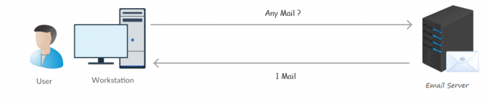 চিত্র ১.৩ - ইউজার মেসেজিং সার্ভারের সাথে সংযোগ গড়ে জেনে নিতে পারে তার কোনো মেইল আছে কিনা। এজন্য ক্লায়েন্ট মেশিনে তাকে মেইল ক্লায়েন্ট সফটওয়্যার চালাতে হবে।