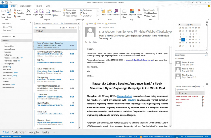 চিত্র ১.৭ - মাইক্রোসফট আউটলুকের মতো গ্রুপওয়্যার ব্যবহার করে ক্যালেন্ডার শিডিউল মেইনটেইন এবং অন্যদের সাথে তা শেয়ার করা যেতে পারে। এর মাধ্যমে কোনো টাস্ক নেটওয়ার্কের কাউকে এসাইন করা, সেই টাস্কের রিপোর্ট সংগ্রহ, মিটিং প্ল্যানিং ও বিভিন্ন ইউজারকে মিটিঙে আমন্ত্রণ জানানো, ইত্যাদি কাজ নেটওয়ার্ক ব্যবহার করে সারা যায়।