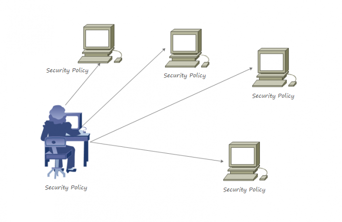 চিত্র ১.২ - পিয়ার-টু-পিয়ার নেটওয়ার্কে প্রতিটি ওয়ার্কস্টেশন নিজ নিজ সিকিউরিটি পলিসি মেইনটেইন করে। সেকারণে কেন্দ্রীয়ভাবে পুরো নেটওয়ার্কের নিরাপত্তা নিশ্চিত করা যায় না।