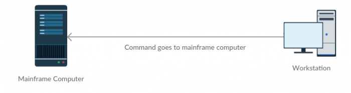 চিত্র ১.৯ - মেইনফ্রেম কম্পিউটারে কোনো অ্যাপলিকেশন চালানোর কমান্ড দেয়া হয় টার্মিনাল থেকে। টার্মিনালের কোনো প্রসেসিং পাওয়ার কিংবা হার্ডডিস্ক স্পেস নেই।