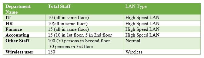 আমরা এখানে ৩ তলা ভবনে জন্য একটি নেটওয়াক ডিজাইন করবো যাতে ৩০০ জন staff এবং ৫ টি Department থাকবে।