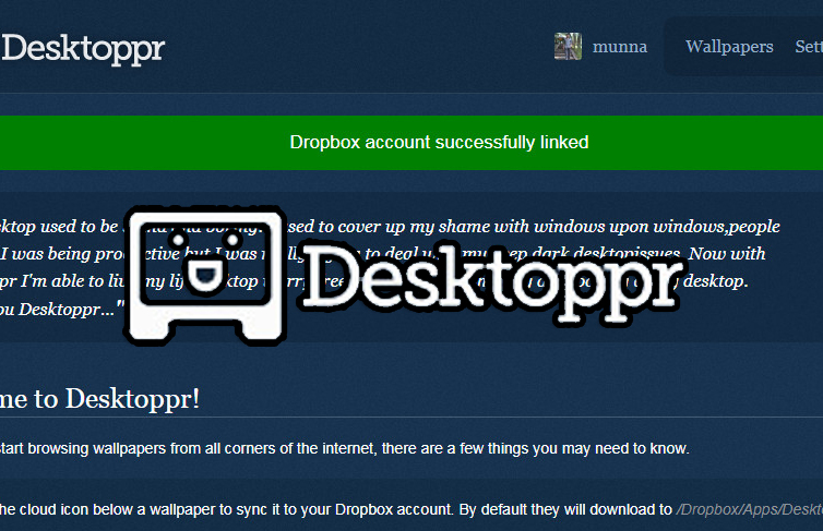 ড্রপবক্স এর শুরু থেকেই অনেক ফিচার, যেমনঃ পার্সোনাল কিছু পাবলিক করা বা হিডেন রাখা, সবার সাথে ফ্রেন্ডলি কিছু শেয়ার করা, ‍বিভিন্ন ফোল্ডার করে সাজিয়ে রাখা এবং অ্যাপস ইনস্টল করা। এগুলো প্রায় সবগুলোর সাথেই আমার পরিচিত নতুন করে বলার কিছু নাই। ঠিক এমন একটি ড্রপবক্স অ্যাপস হচ্ছে Desktoppr সেই ড্রপবক্সে প্রথম থেকে কাজ শুরু করা একটি অ্যাপস যার মূল কাজ হচ্ছে আপনার ওয়ালপেপার সংগ্রহের মাত্রা বৃদ্ধি করা। মানে আপনি তাদের একটি অ্যাপস এর মাধ্যমে তাদের সাইটে দেওয়া বিভিন্ন সুন্দর- অসাধারণ এইচডি ছবি গুলো এক ক্লিকে আপনার ড্রপবক্সে রাখতে পারবেন। আপনাকে যা করতে হবেঃ
