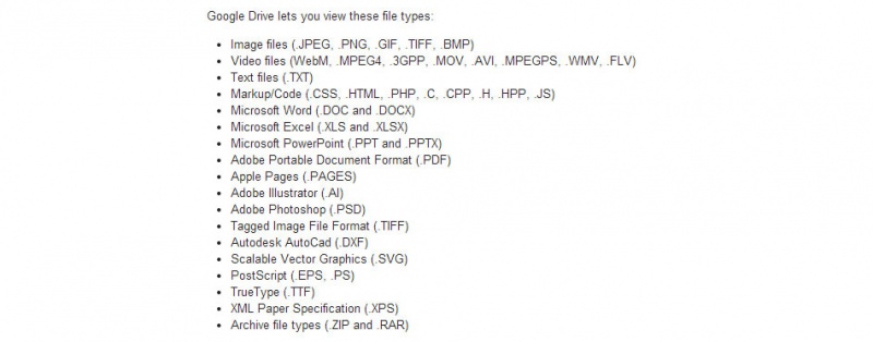 গুগল ড্রাইভ দিয়ে আপনি প্রায় ৩০ ফরমেটের ফাইল শো করাতে পারেন। যেমনঃ.CSS, .HTML, .PHP, .C, .CPP, .H, .HPP, .JS ইত্যাদি এবং অবশ্যই আপনি.ZIP এবং.RAR ফরমেটের ফাইল দেখতে পারবেন। তাছাড়া এডোবি ইলাস্ট্রেটার এর ফাইল এবং ভেক্টর গ্রাফিক্স এর  ফাইল ও সার্পোট করে। ২৫ এমবির নিচে হলে ফাইল সার্পোট করবে যদি বেশি হয় তবে নাও হতে পারে।