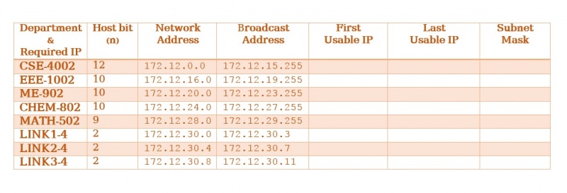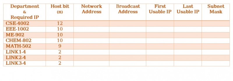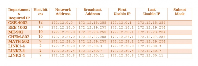 Ex: CSE Department এর required IP হচ্ছে 4002 টি। আমরা যদি 211 দেই তাহলে এতে IP Address এর সংখ্যা হয় 2048 টি, যা আমাদের requirement fulfil করে না। কিন্তু আমরা যদি 212 দেই তাহলে এতে IP Address এর সংখ্যা হয় 4076 টি, যা আমাদের requirement fulfil করেও কিছু IP বেশী রয়ে যায়। মনে রাখতে হবে IP Assigning সবসময় 100% fill up করা যায় না। সুতরাং আমাদের এখানে n এর value হচ্ছে 12 যা Host bit সংখ্যা নির্দেশ করে। এভাবে সম্পূর্ণ Column টি পূর্ণ করতে হবে।