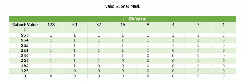 এবার 3rd Octet (11110000) এর Decimal value হচ্ছে 240. সুতরাং Subnet Mask হচ্ছে 255.255.240.0। নিচের Table টি মনে রাখলে খব তাড়াতাড়ি Subnet Mask নির্ণয় করা যায়।