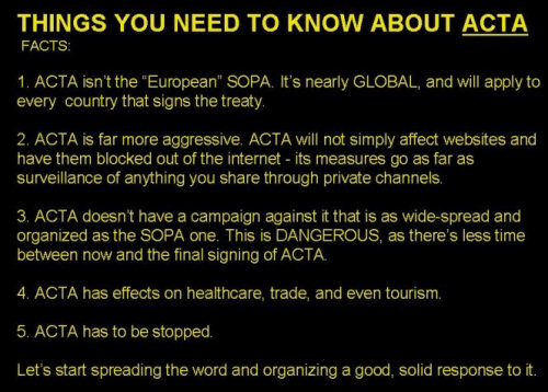 ইউরোপিয়ান ইউনিয়ন এর সদস্যদের ভোটে ACTA বাতিল হয়ে যায়।ACTA বন্ধের পক্ষে ভোট পরে ৪৭৮ টি যেখানে পক্ষে ভোট ছিল মাত্র ৩৯ টি।আসুন জেনে নেই ACTA কি আর এটা বন্ধ হবাতে আমাদের কি উপকার হল