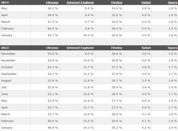 উপরে দেখা যাচ্ছে Chrome আসার পরে খুব দ্রুত তারা জনপ্রিয় তা অর্জন করেছে এবং বর্তমানে বিশ্বের ৫৯.২% মানুষ Chrome ব্যবহার করে। দ্বিতীয় অবস্থায় আছে Firefox, তাদের ব্যবহারকারীর সংখ্যা ২৪.৯%। তৃতীয় অবস্থায় আছে Internet Explorer, চতুর্থ অবস্থায় আছে Safari, এবং পঞ্চম অবস্থায় আছে Opera।