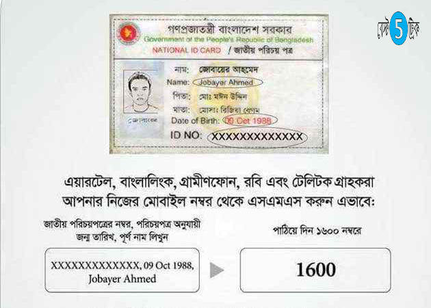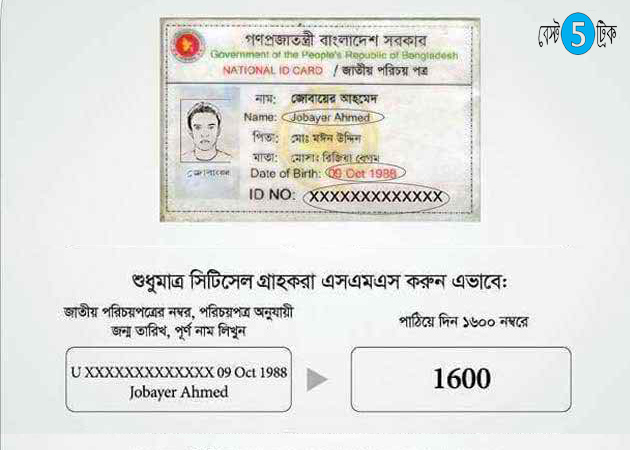 আপনি যদি এয়ারটেল, বাংলালিংক, গ্রামীণফোন, রবি এবং টেলিটক মোবাইল ফোন অপারেটরের গ্রাহক হন তাহলে প্রথমে আপনার মোবাইলের ম্যাসেজ অপশনে গিয়ে লিখুন জাতীয় পরিচয়পত্রের নম্বর, পরিচয়পত্র অনুযায়ী আপনার জন্ম তারিখ এবং আপনার পূর্ণ নাম। এরপর তা পাঠিয়ে দিন ১৬০০ নম্বরে।