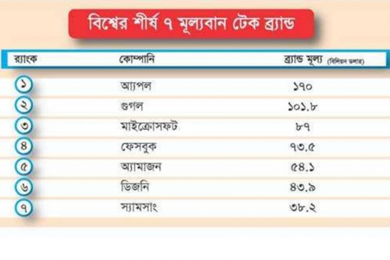 প্রতি বছর বিশ্বের সেরা ১০০ ব্র্যান্ডের একটি তালিকা প্রকাশ করে থাকে ব্যবসায়-বিষয়ক সাময়িকী ফোর্বস। কোম্পানিগুলোর তিন বছরের আয় ও সে অনুযায়ী ওই কোম্পানিটি তার বিভাগে ঠিক কতটুকু আধিপত্য রাখছে, তার ওপর নির্ভর করে তালিকাটি তৈরি করা হয়। চলতি বছরের জন্য ফোর্বসের তালিকা প্রকাশ পেয়েছে গত মঙ্গলবার। এবারের তালিকায় থাকা সেরা ১০০ ব্র্যান্ডের সম্মিলিত বাজারমূল্য ১ দশমিক ৯৫ ট্রিলিয়ন ডলার। শীর্ষ পাঁচে অ্যাপল ও গুগল ছাড়াও রয়েছে মাইক্রোসফট (৮ হাজার ৭০০ কোটি ডলার), ও ফেসবুক (৭ হাজার ৩৫০ কোটি ডলার) ফোর্বসের তালিকা অনুযায়ী ব্র্যান্ড ভ্যালুর দিক থেকে সবচেয়ে নাজুক অবস্থানে রয়েছে আইবিএম। মার্কিন এ প্রযুক্তি কোম্পানিটি গত বছরের তুলনায় ২০ শতাংশ ব্র্যান্ড ভ্যালু হারিয়েছে।