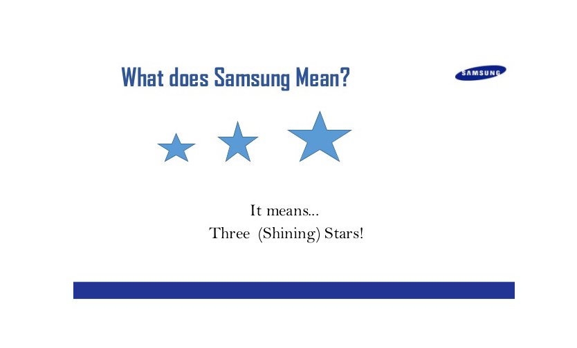 স্যামসং নামের অর্থ জানেন? হয়তো ভাবছেন এটি কোনো চায়নিজ শব্দ! কিন্তু না। Samsung এর মানে হচ্ছে Three Stars বা তিন তারকা! কোরিয়ান দুটি শব্দ Sam (Three) এবং Sung (Stars) থেকে এটির উৎপত্তি। কোম্পানির এই নামটি কোম্পানির প্রতিষ্ঠাতা সেই ১৯৩০ এর দশকে পছন্দ করেছিলেন কারণ তার কাছে মনে হয়েছিল এটি কোম্পানির শুভ ভাগ্যে নির্দেশ করবে। বলা বাহুল্য যে কোরিয়ান ভাষায় তিন বা Three কোনো প্রকারের বড় এবং পাওয়ারফুল কোনোকিছুর ইঙ্গিত রেখে থাকে। তাই কোম্পানির নাম স্যামসং বা তিন তারকা রাখা হয়েছিল।