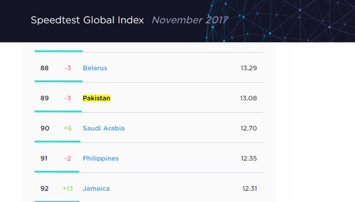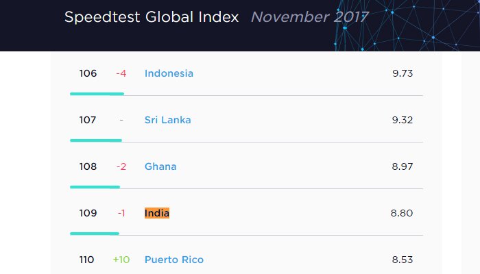 স্পিডটেস্ট গ্লোবাল ইনডেক্সের সমীক্ষা অনুযায়ী, নভেম্বরে প্রথম স্থানে রয়েছে নরওয়ে। ডাউনলোড স্পিড ৬২.৬৬ মেগাবাইট প্রতি সেকেন্ড। চিন রয়েছে ৩১ নম্বরে। ২৬.৩২ এমবিএস ডাউনলোড স্পিডে মার্কিন যুক্তরাষ্ট্র রয়েছে ৪৪ নম্বর স্থানে। পাকিস্তান সেই নিরিখে আছে ৮৯ নম্বরে। ইন্টারনেট স্পিড ১৩.০৮ এমবিএস। পাকিস্তান থেকে আরও ১৯ নম্বর পিছিয়ে ভারত। মাত্র ৮.৮০ এমবিএস ডাউনলোড স্পিড ভারতের।