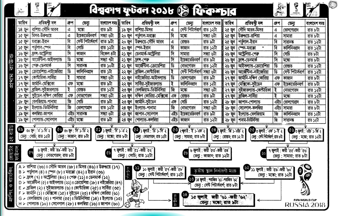 দরজায় করা নাড়ছে "দ্যা গ্রেটেস্ট শো অন আর্থ"। শুরু হয়ে গিয়েছে দলেদলে রেশারিশি, বাসার ছাদে তো সবাই টাঙ্গিয়ে ফেলেছেন প্রিয় দেশের পতাকা। এবার শুধু বাকি সময়সূচী টাঙ্গানোর। ভেবে দেখুন, আমাদের মাঝে এমন কিছু লোক আপনাকে প্রায়ই জিজ্ঞাসা করে যে, আচ্ছা আগামিকাল কার খেলা একটু বলবেন, প্লিজ। তো আপনি যদি আপনার বাসার ছাদে বা দেয়ালে বড় করে একটা খেলার সময়সূচী টাঙ্গিয়ে দেন, তাহলে অনেকেই কিন্তু প্রতিদিন এখান থেকে সময়সূচী দেখে নেবে, আর আপনার অভিনব এই পদ্ধতির তারিফ করবে।