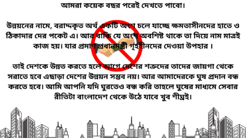 যদিও সরকার নানান ব্যবস্থা গ্রহণ করছে। তবে তা কখনোই আলোর পথ দেখবে না কারণ ক্ষমতায় আসনের ব্যক্তিরা যদি সৎ না হয় এবং আপনি আমি যদি ঘুষ দেওয়া বন্ধ না করি। এবং অন্যায় দেখেও তাকে নিয়তি ভাবা আমাদের বন্ধ করতে হবে।