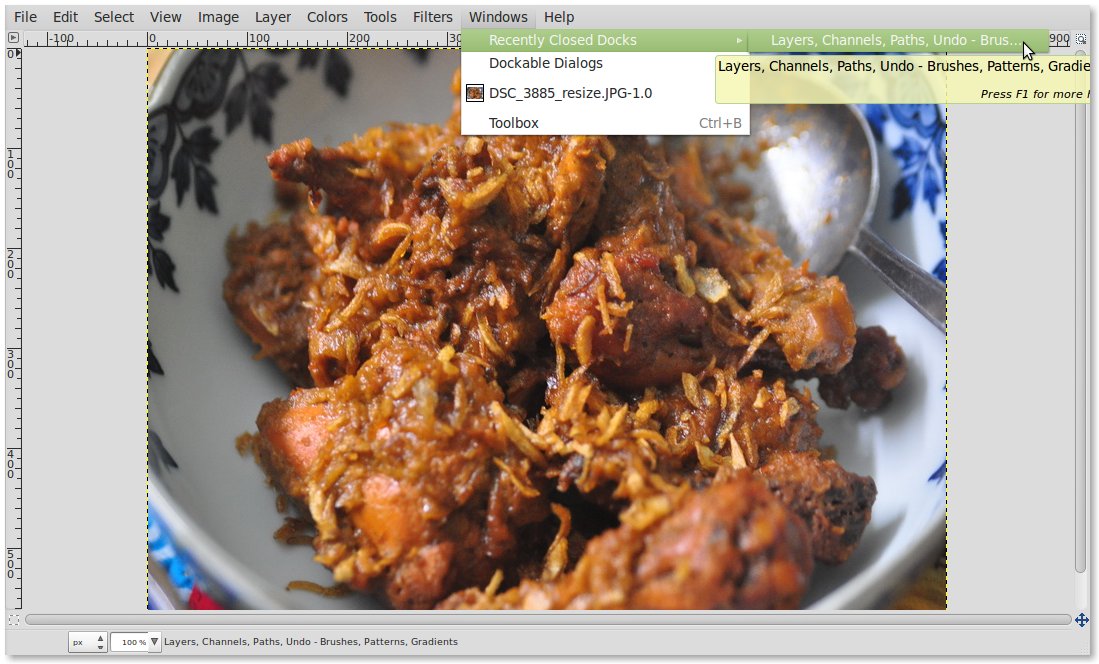 মেনু থেকে: Windows --> Recently Closed Docks --> Layers, Channels, Paths, Undo - Brus...