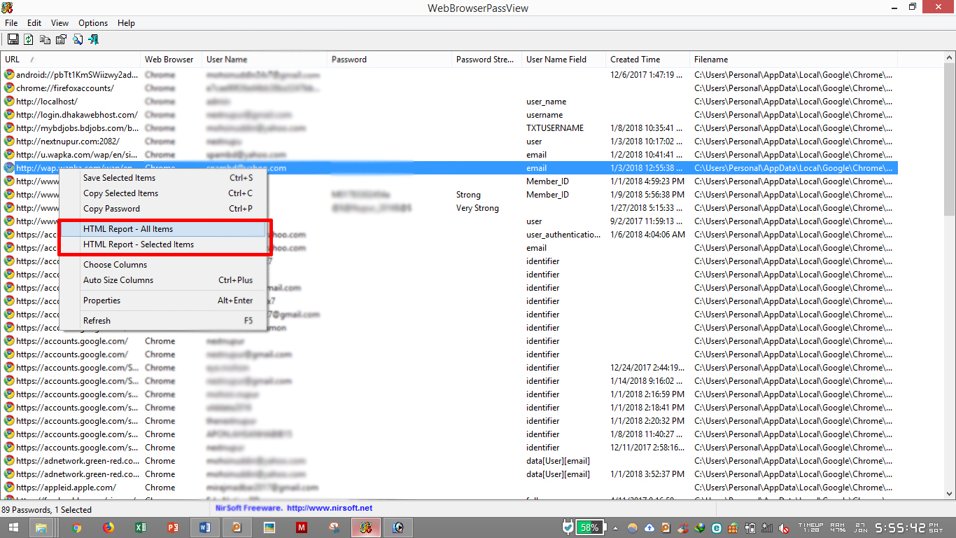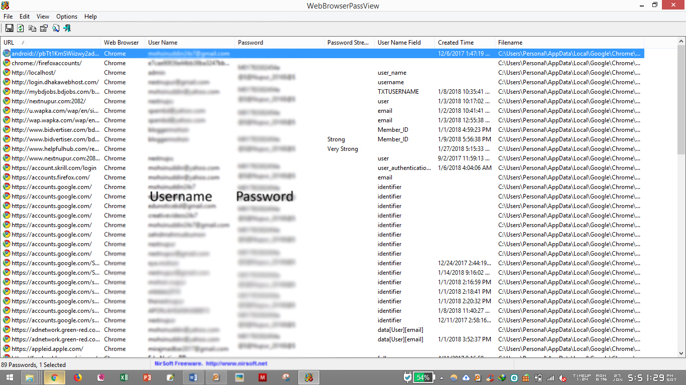 ফাইলটি চালু করার পর আপনি নিচের চিত্রের মত করে সমস্ত পাসওয়ার্ড এবং ইউজারনেম দেখতে পাবেন। আপনার কম্পিউটারে যত ব্রাউজার-ই থাকুক না কেন। সব দেখতে পাবেন। আমার ব্যক্তিগত নিরাপত্তার কারণে আমি আমার ইউজারনেম ও পাসওয়ার্ড অস্পষ্ট করে দিয়েছি।