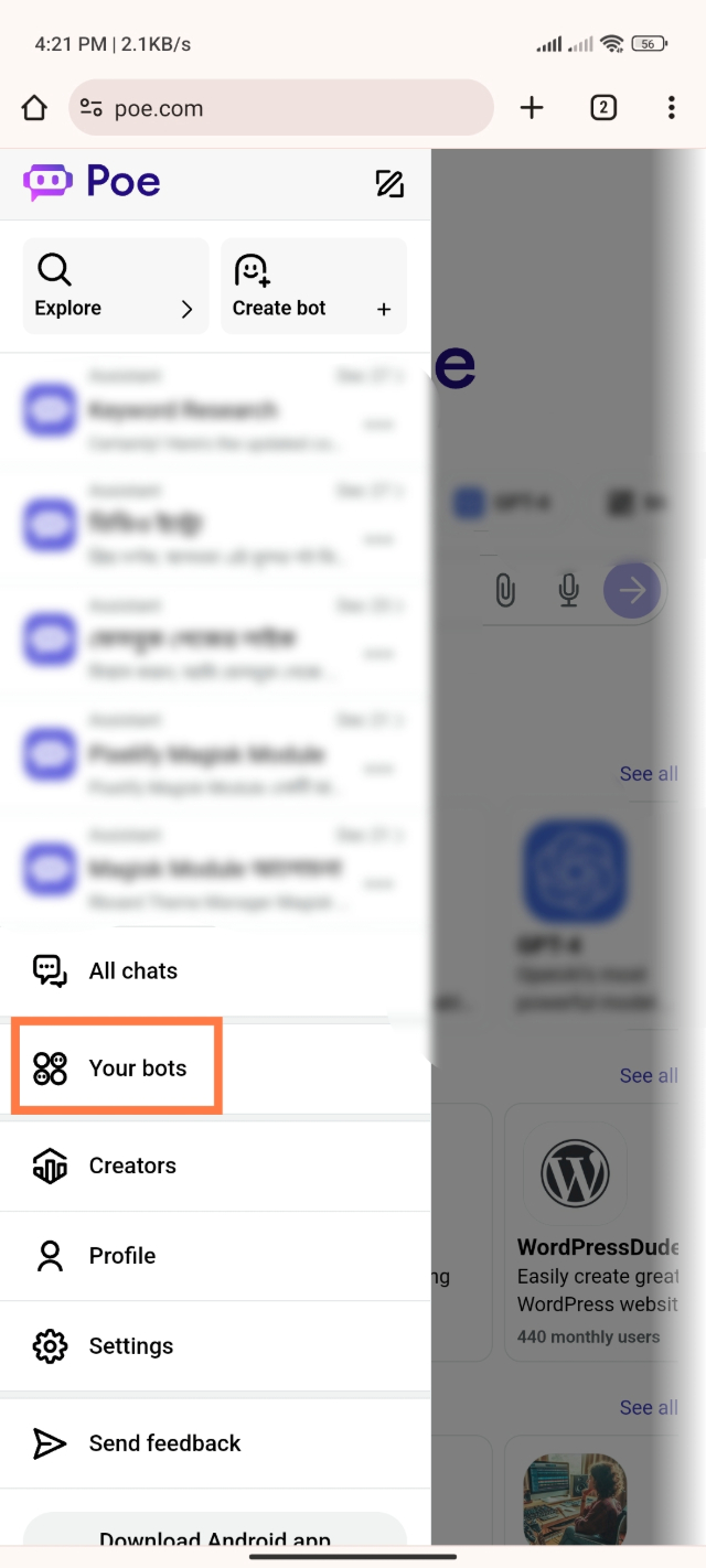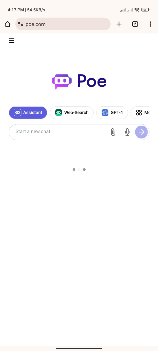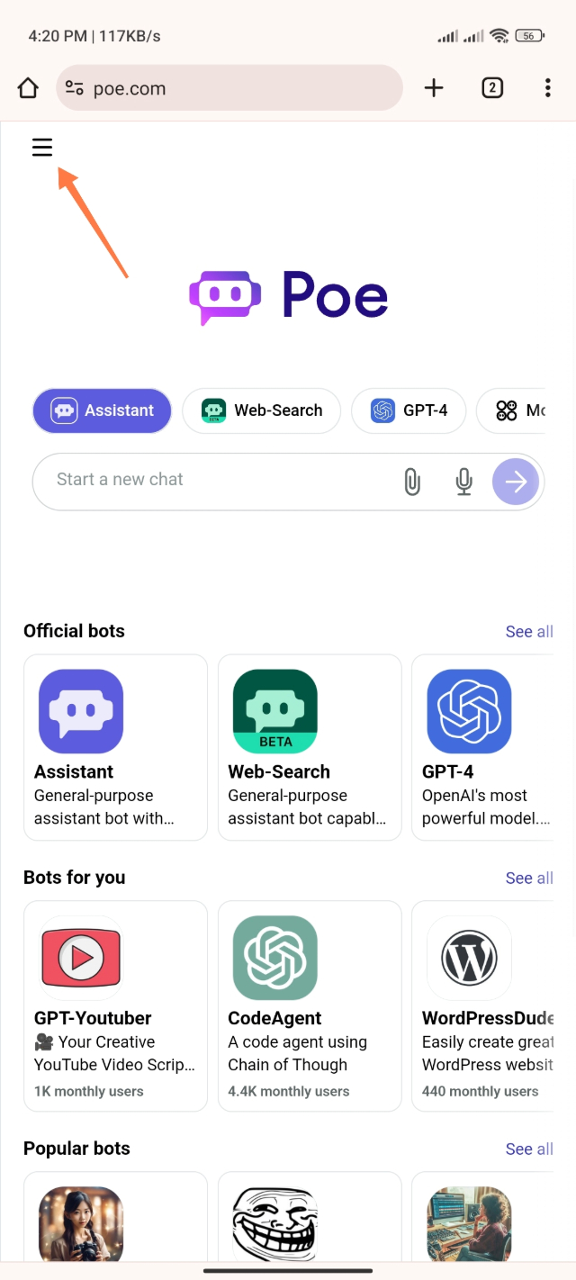 ৩. Poe Website অ্যাকাউন্ট করা হয়ে গেলে আপনারা নিচের মতো একটি ইন্টারফেস দেখতে পারবেন। এবার আপনার বাম কোণের একদম উপরে থ্রি-ডট মেনুবারে ক্লিক করবেন।