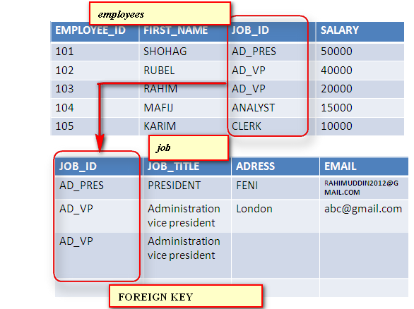 দেখেন employees and job টে্লিরে মধ্যে job_id একই এখানে একে অন্যর সাথে ডেটা শেয়ার করতে পারে এটি আইডি বা অন্য যে কোন কিছু হতে পারে । প্রোগ্রামটি দেখুন