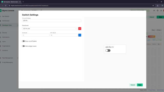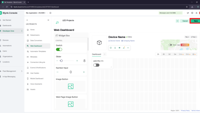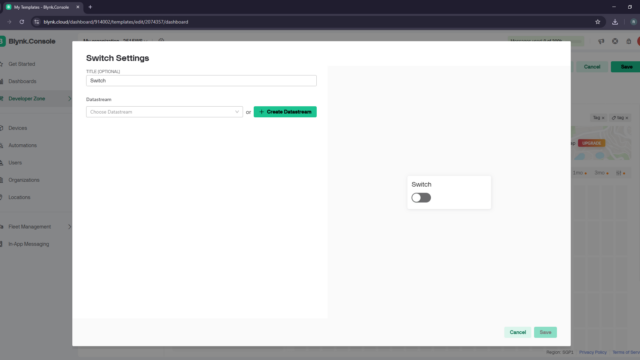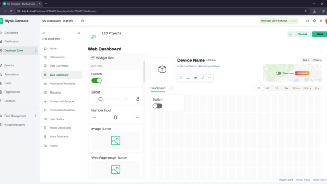 এখন LED Project এর Sidebar থেকে Web Dashboard ক্লিক করি এবং Widget Box থেকে Switch ড্রাগ করে Dashboard এ প্লেস করি।