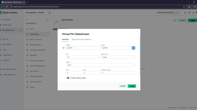 এরপর “+ New Datastream” বাটনে ক্লিক করে Dropdown থেকে Virtual Pin অপশনটি সিলেক্ট করি। এরপর নিচের মতো একটি Interface আসবে, যেখানে Name ফিল্ডে ভার্চুয়াল পিন V0 এবং ছবি অনুযায়ী অন্যান্য কনফিগারেশন করে Create Button এ ক্লিক করি।