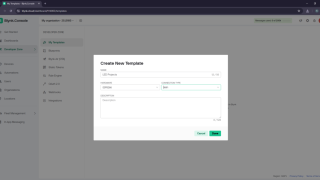 এরপর বাম পাশে থাকা মূল Side Panel থেকে Developer Zone → My Template সেকশনে যাই। সেখানে গিয়ে “+ New Template” বাটনে ক্লিক করলে একটি নতুন Interface ওপেন হবে। এখানে টেমপ্লেটের নাম নিজের মতো দিয়ে, Device অপশন থেকে ESP8266 এবং Connection Type হিসেবে WiFi সিলেক্ট করি। এরপর Done বাটনে ক্লিক করি।