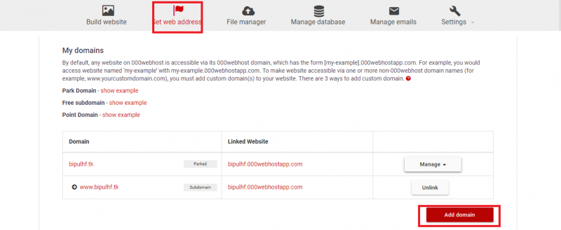 এবারে ইচ্ছা আপনার যে আপনি কিভাবে আপনার ওয়েবসাইট সাজাবেন। তবে খেয়াল করবেন ইতিমধ্যেই আপনাকে একটি মেইল করা হয়েছে যেখানে Nameservers এবং IP Adress পাঠানো হয়েছে যা আপনি আগের ট্যাবে এ গিয়ে যোগ করবেন এবং ডোমেইনটি 000webhost-এ ব্যবহার উপযোগী হয়ে গেল। আপনি এখন আপনার মন মত ওয়েবসাইট সাজাতে পারবেন। তবে প্রথমে আপনাকে 000webhost-এর সাব-ডোমেইন ব্যবহার করতে বলবে। চিন্তা করবেন না। আপনার ওয়েবসাইট ঠিক করা হয়ে গেলে আপনি দেখুন উপরে Set Web Addres লেখা একটি বাটন আছে। ক্লিক করলেই আপনি নিচে দেখতে পাবেন Add Domain। সেখান থেকে আপনার নিজের ডোমেইনটি Add করে নিন।