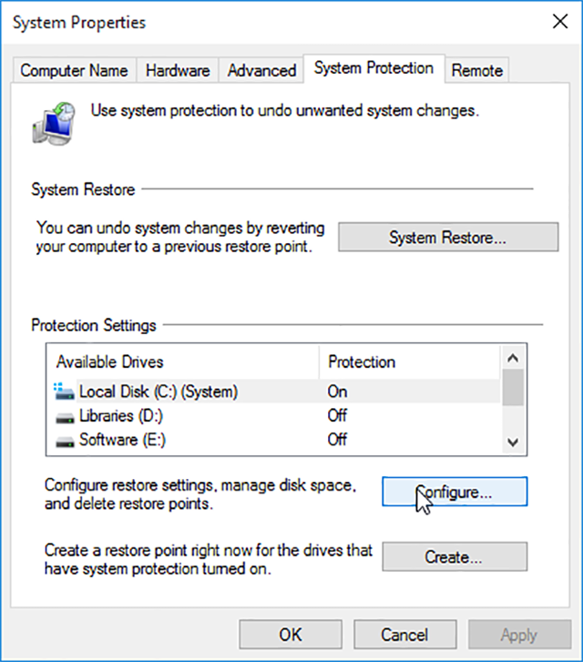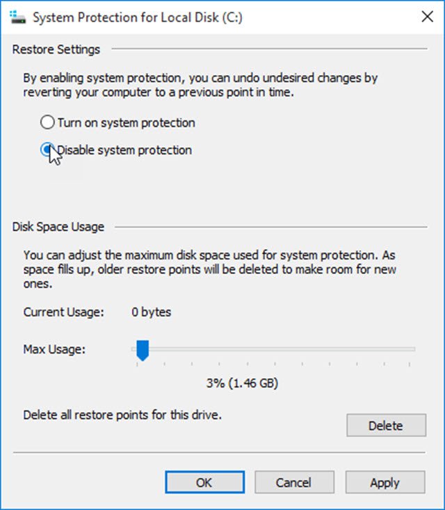 Configure বাটনে ক্লিক করুন।লক্ষ করুন System Protection অন হেয় আএচ এটাকে অফ করেত হবে।তার আগে ইতিমেধ্য তৈরি হওয়া ফাইলগুলো ইডিলট করে নিন।