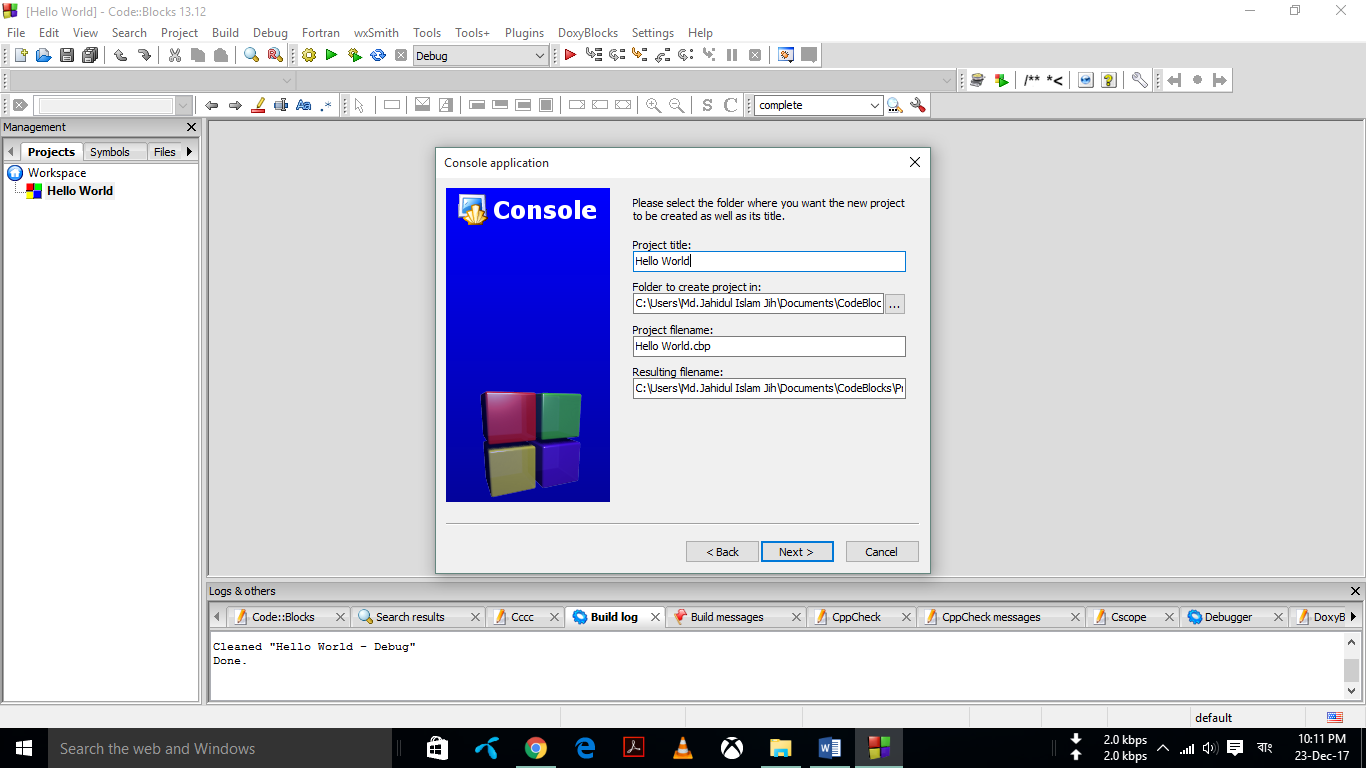 আপনি যদি এই বিষয়ে একেবারেই নতুন হন তাহলে আপনার কিছই না বুঝতে পারা সবাভাবিক।আপাদত আপনাকে কিছুই বুঝতে হবে না।শুধু Build মেনু থেকে Build and run এ ক্লিক করুন।(শর্টকাট F9)।