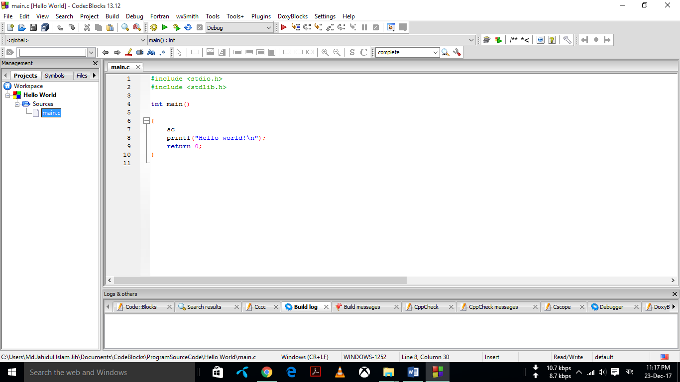 তারপর HelloWorld>Sources>main.c তে ডাবল ক্লিক করলে এরকম একটা উইন্ডো আসবে।