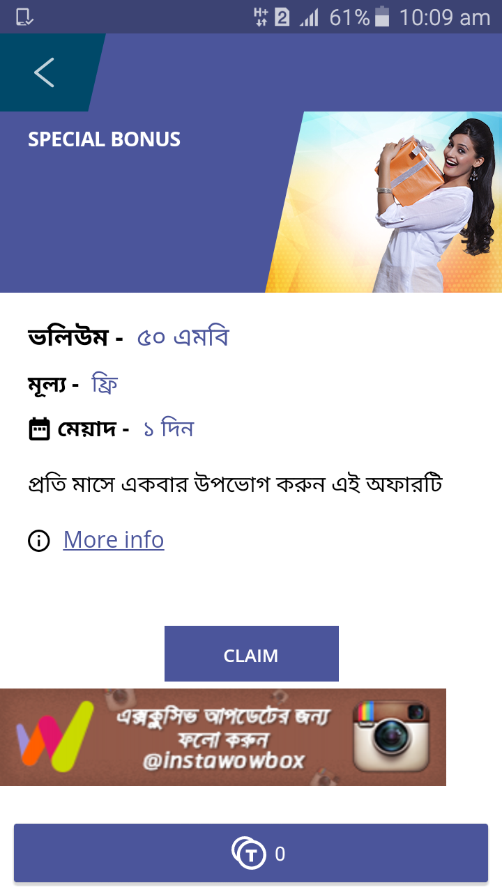 এবার উপরের ছবিতে নীল বাক্সে লেখা ক্লাইম এ ক্লিক করুন। ওটাতে ক্লিক করলেই আপনি এমবি পেয়ে যাবেন।