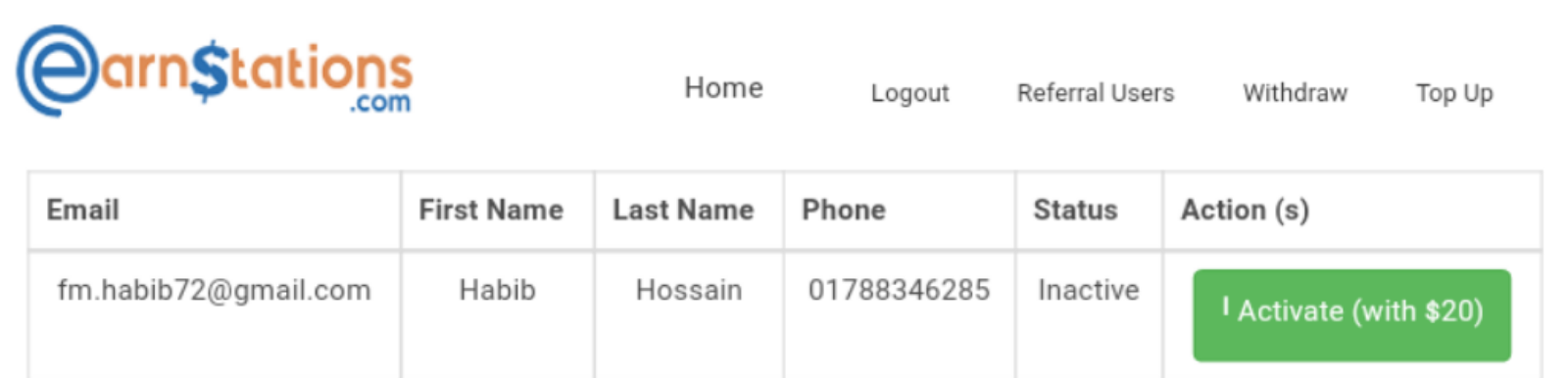 কিন্তু না আসলে আমার 15$= 1, 200 BDT খরচ হবে কারন আমার রেফারে আপনার একাউন্ট Inactive থেকে Active হওয়ার জন্য Earn stations আমাকে 5$=400 BDT সাথে সাথে বোনাস দিবে।