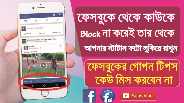 আজকে আপনাদের দেখাবো ফেসবুকে কাউকে ব্লক বা আনফ্রেন্ড না করে কিভাবে তার থেকে আপনার পাবলিক স্টাটাস বা ফটো গুলি লুকিয়ে রাখবেন। তাহলে সে আপনার স্টাটাস বা ফটো গূলো দেখতে পারবে না!