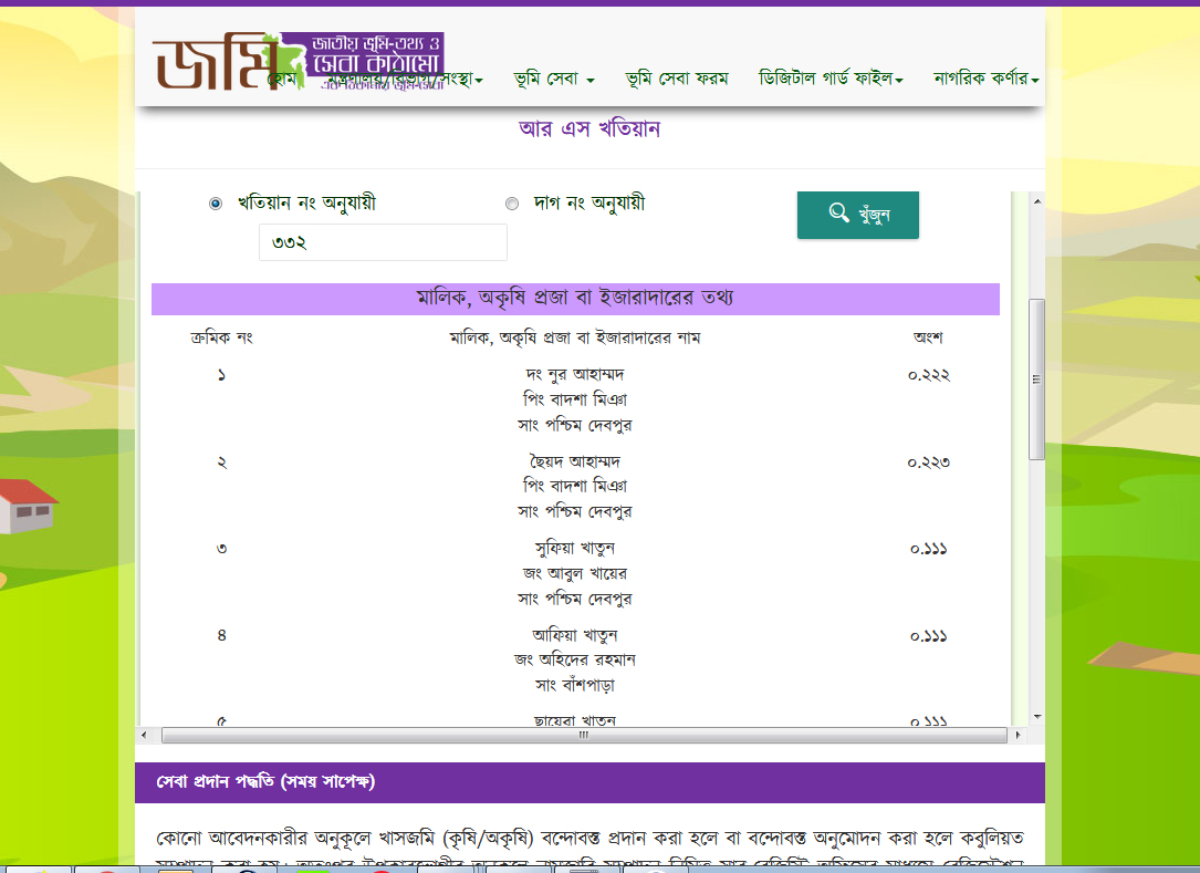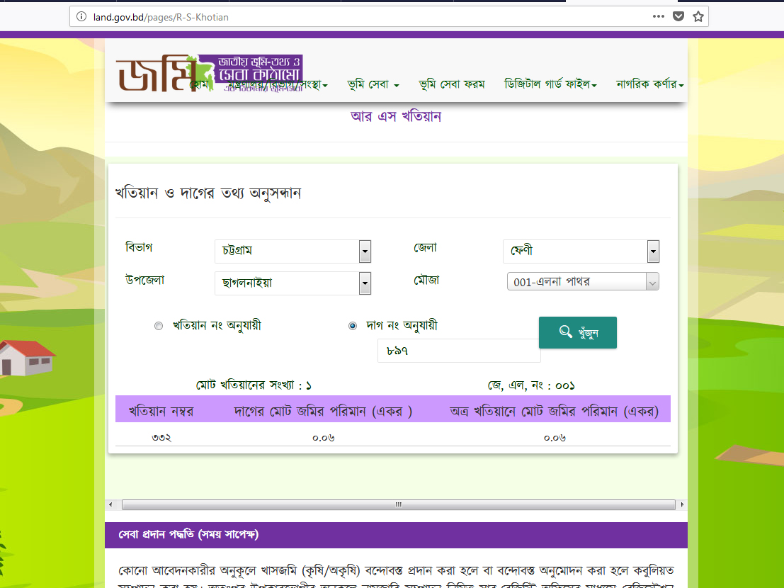 আনন্দের বিষয়, সরকারের ডিজিটালাইজেশনের কিছুটা ছোয়া ভূমি অধিদপ্তরের ওয়েবসাইট দিচ্ছে, আপনি চাইলে কোন জমি কার নামে রেকর্ড, জমির পরিমাপ কত, খতিয়ান নাম্বার ইত্যাদি দেখে নিতে পারবেন অনলাইনে।