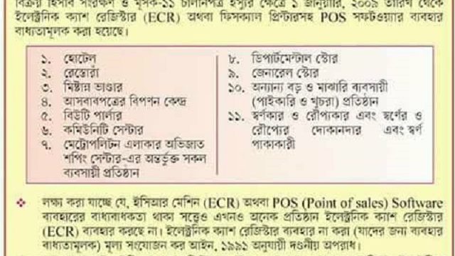 হোটেল, রেস্টুরেন্ট, কমিউনিটি সেন্টার সহ মেট্রপলিটন এলাকার যাবতীয় শপিংমলে Point of sale software বাধ্যতামূলক করেছে কাস্টকমস, এক্সাইজ ও ভ্যাট কমিশন। ইলেক্টিক ক্যাশ রেজিস্টার ব্যবহার না করা মূল্য সংযোজন আইন ১৯৯১ অনুযায়ী দণ্ডনীয় অপরাধ।